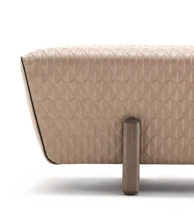 Bench in poplar solid wood, upholstered with differentiated density, feet in solid canaletto walnut. Upholstery as photo: leather and quilted leather.