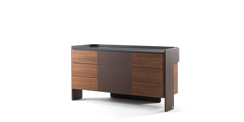 Structure in canaletto walnut with internal part in maple, drawers in leather and metal texture, base in bronze.