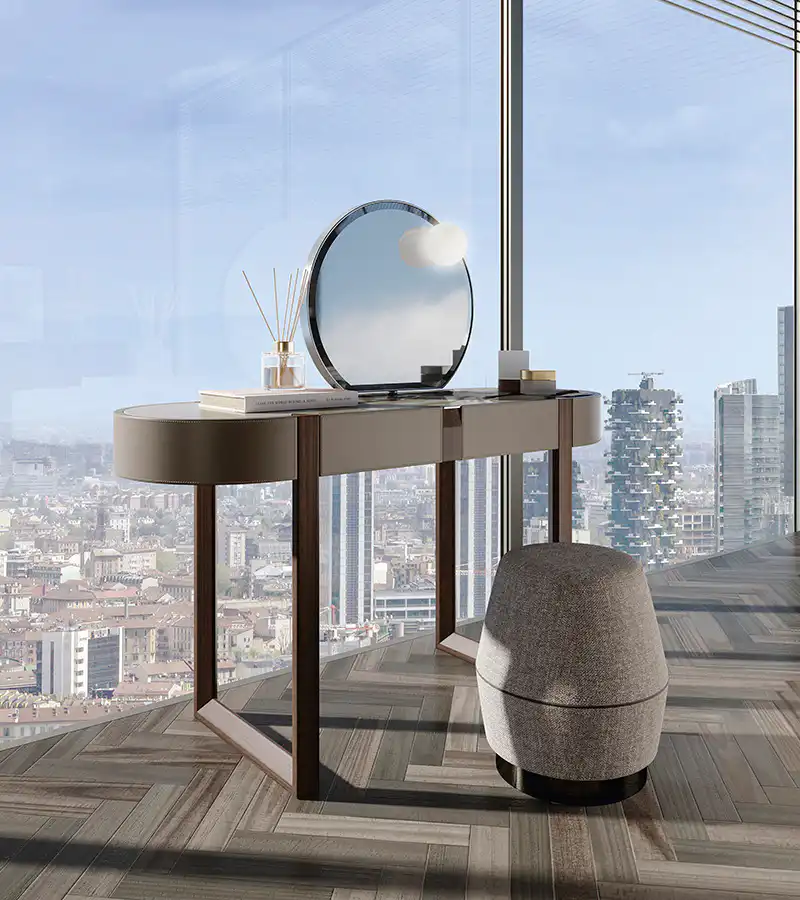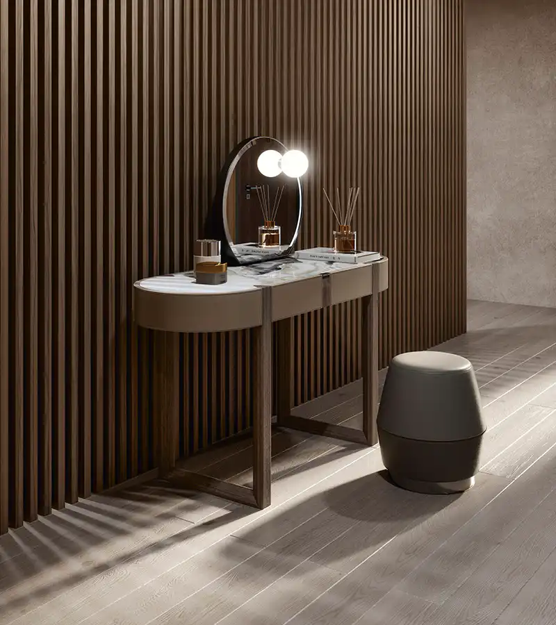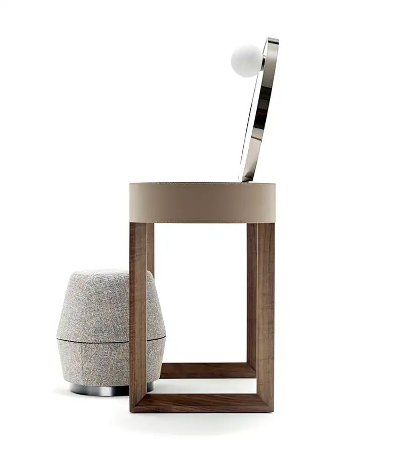 Dressing table in solid canaletto walnut, dover white marble top and leather covering on the sides, with mirror in polished black nickel with external light.