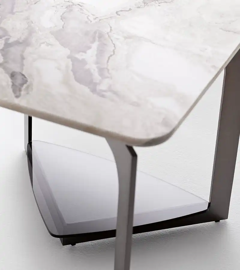 Small tables with structure in polished black nickel, marble top and with smoked glass lower shelf.