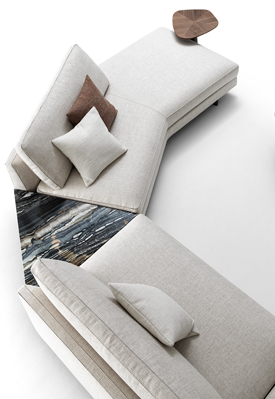 Divano con struttura in abete massello, imbottito a densità differenziate con schienale in piuma d’oca e seduta in poliuretano espanso e memory foam, arricchito da piedini in nichel nero lucido. Rivestimento come foto: tessuto.