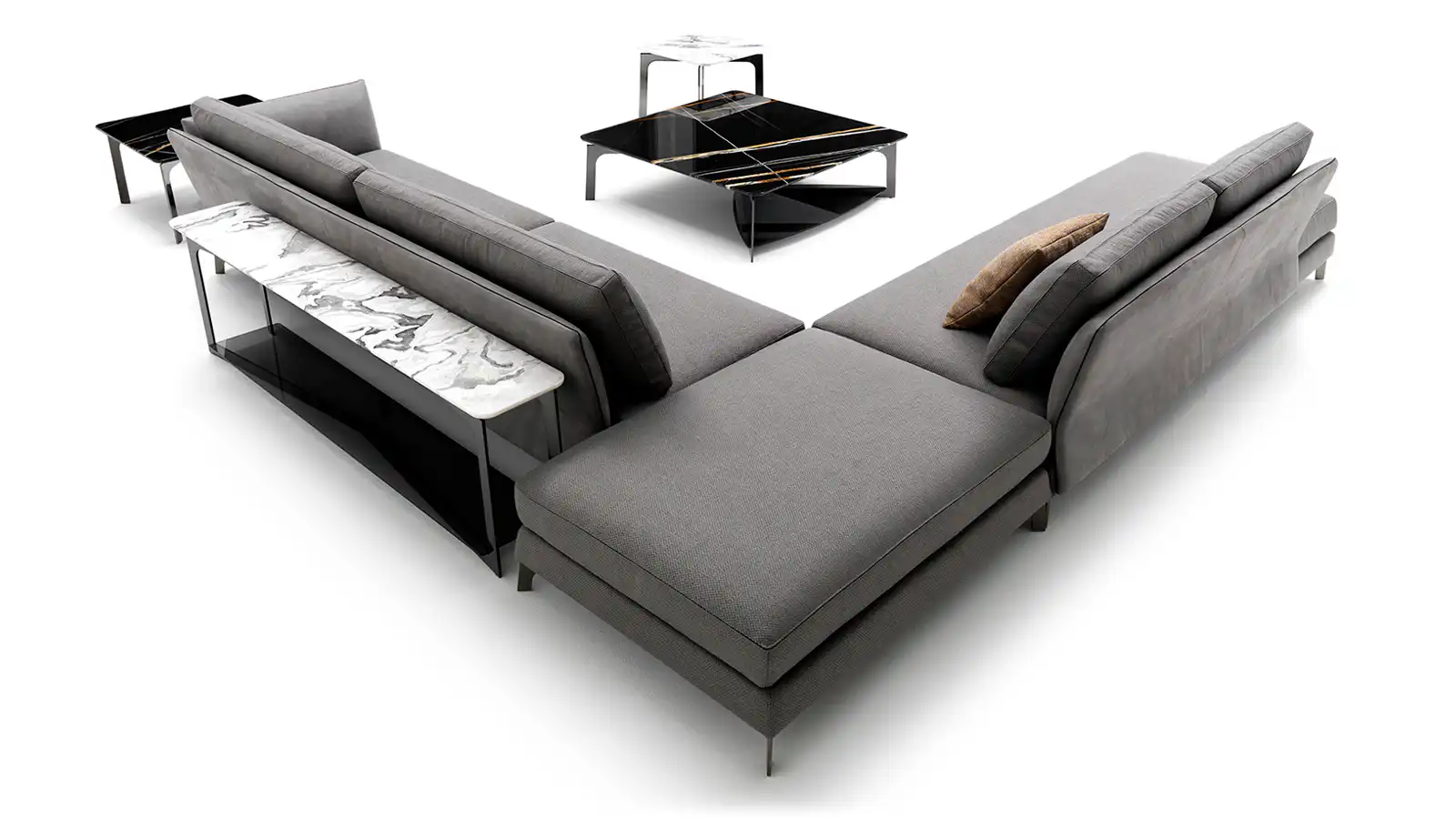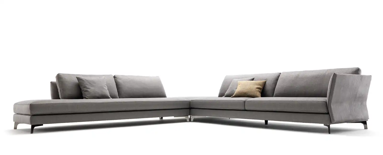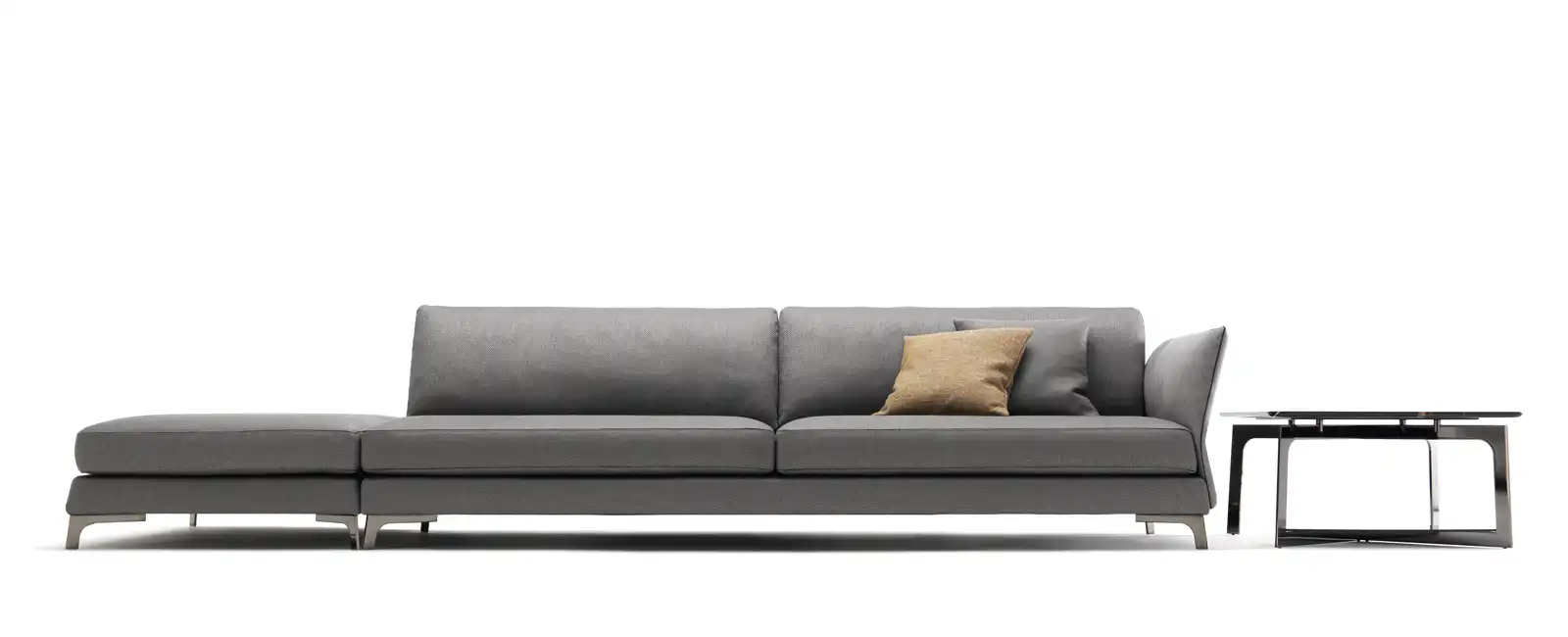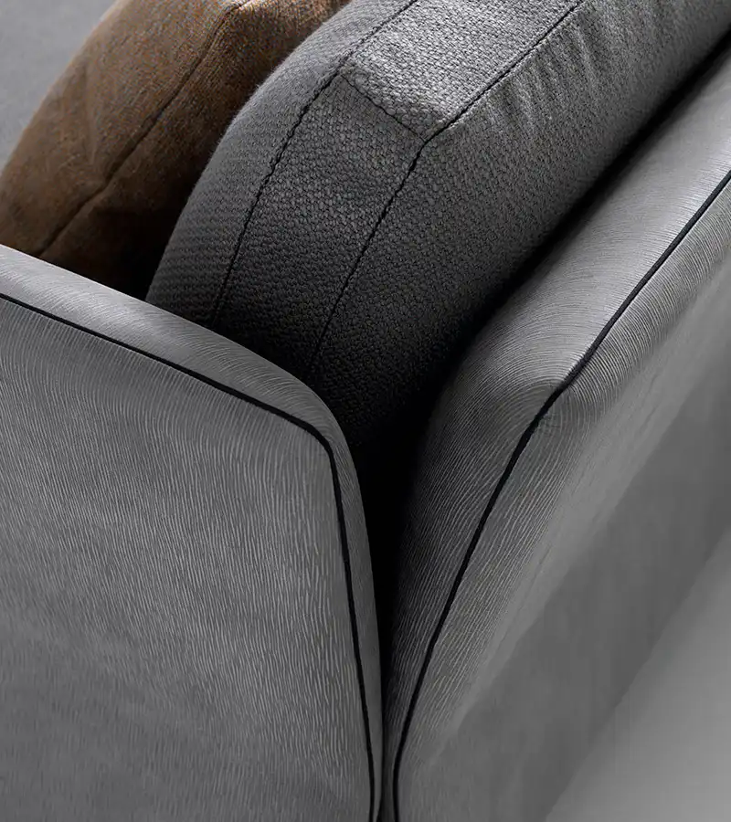 Divano con struttura in abete massello, imbottito a densità differenziate con schienale in piuma d’oca e seduta in poliuretano espanso e memory foam, arricchito da piedini in nichel nero lucido. Rivestimento come foto: tessuto e pelle.