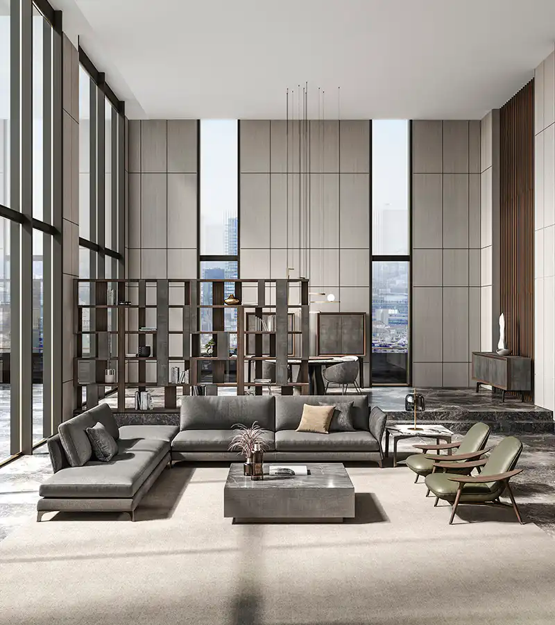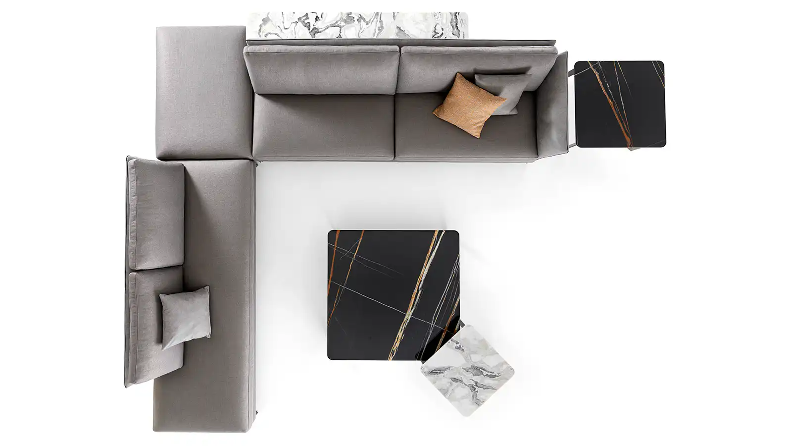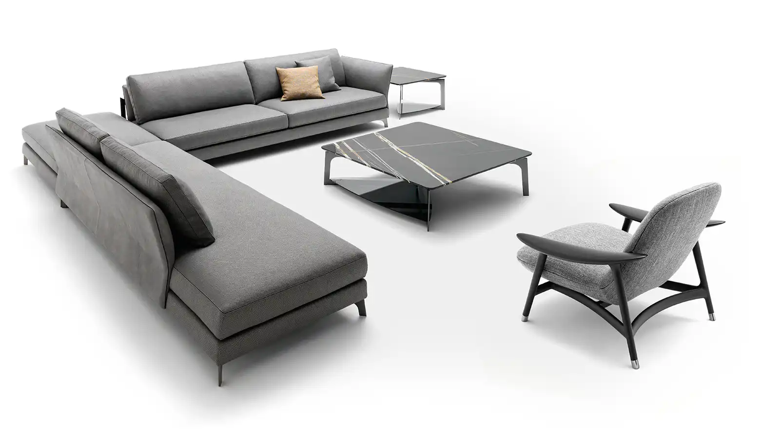Divano con struttura in abete massello, imbottito a densità differenziate con schienale in piuma d’oca e seduta in poliuretano espanso e memory foam, arricchito da piedini in nichel nero lucido. Rivestimento come foto: tessuto e pelle.