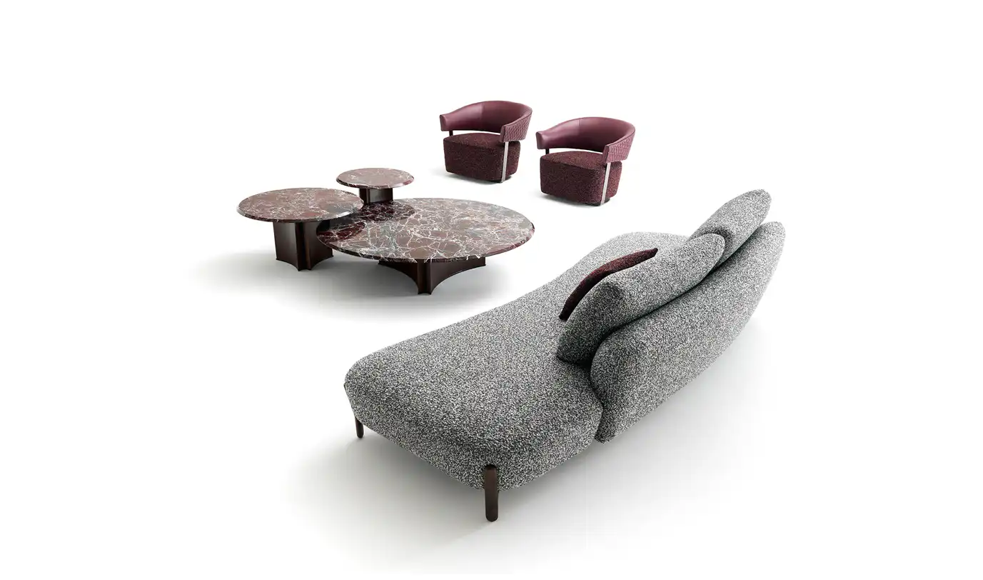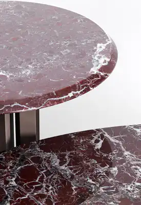 Tavolini con base in noce canaletto scuro e piano marmo rosso lepanto.