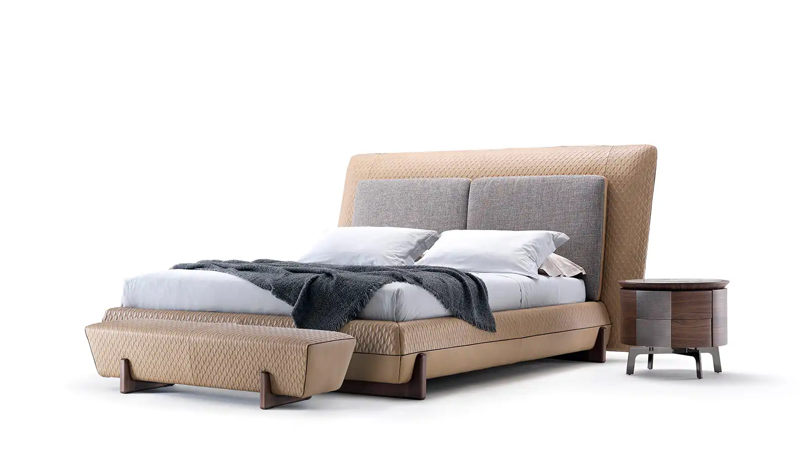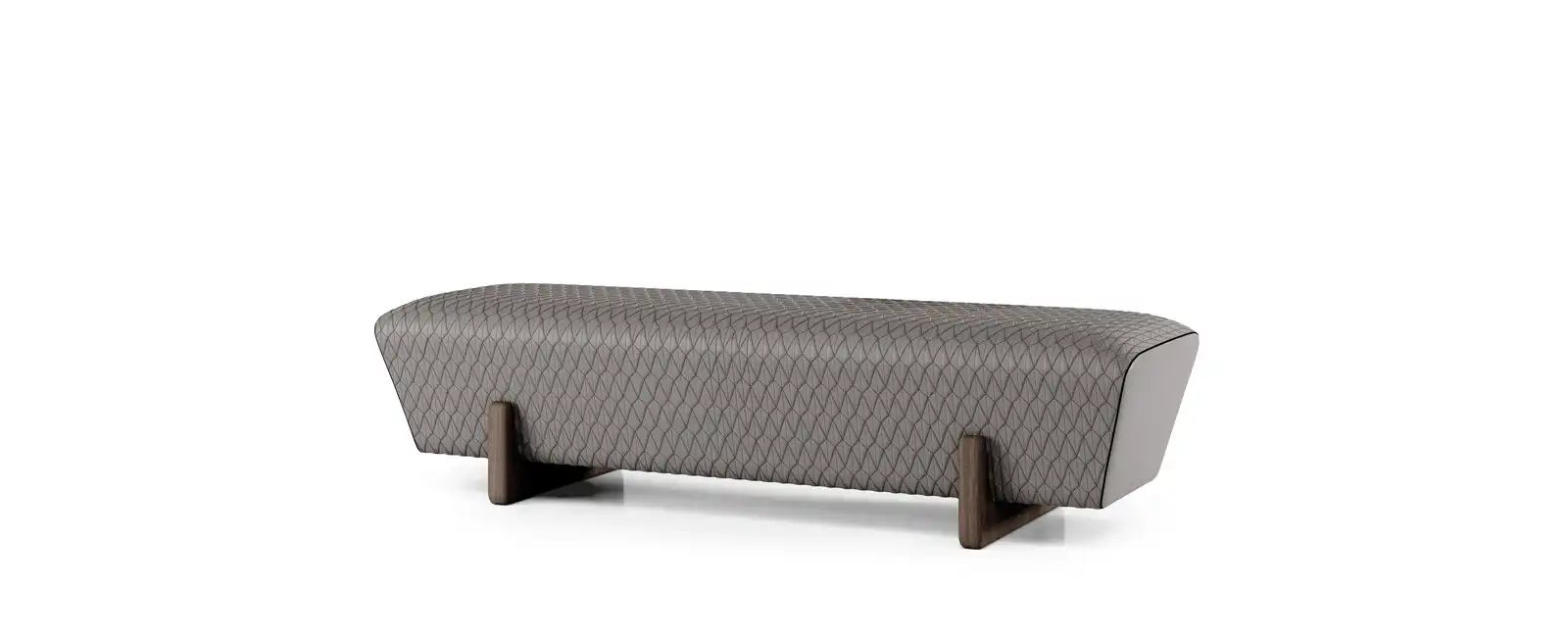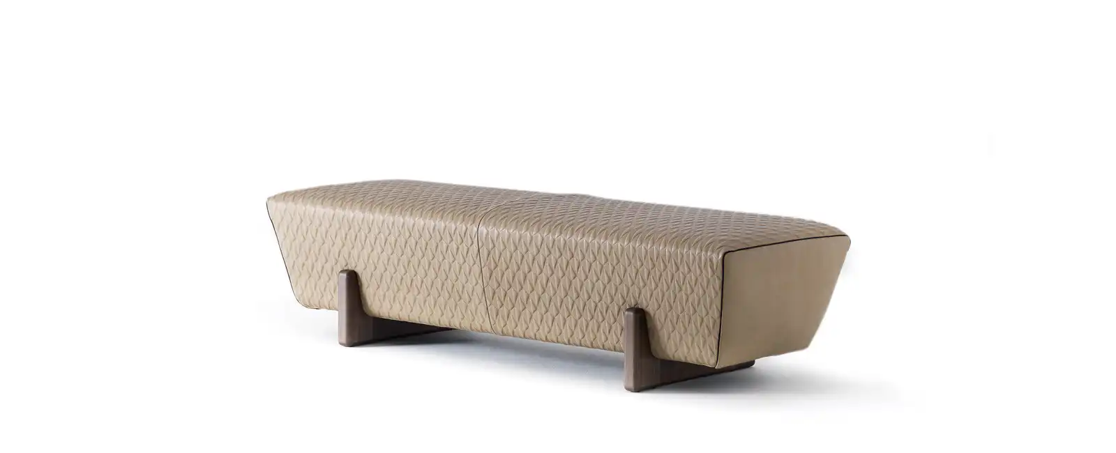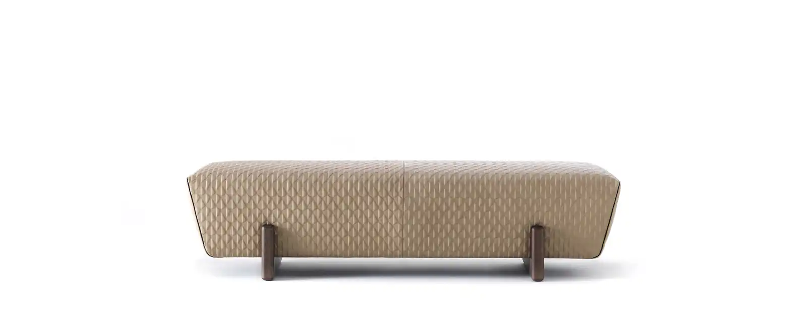 Panchetta con struttura in pioppo massello, imbottitura a densità differenziate, con raffinati piedini in noce canaletto massello. Rivestimento come foto: pelle e pelle trapuntata.