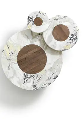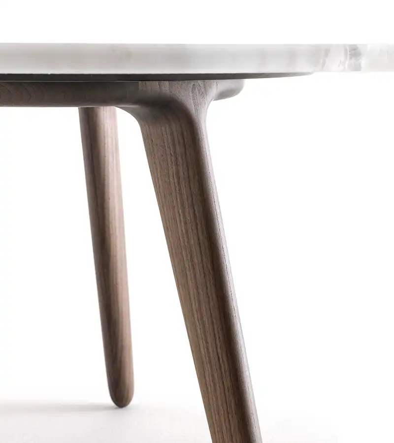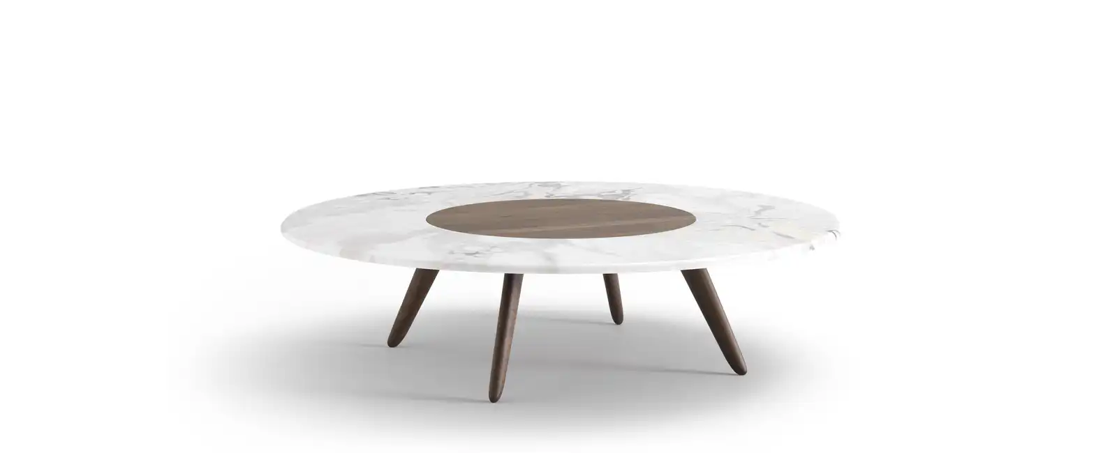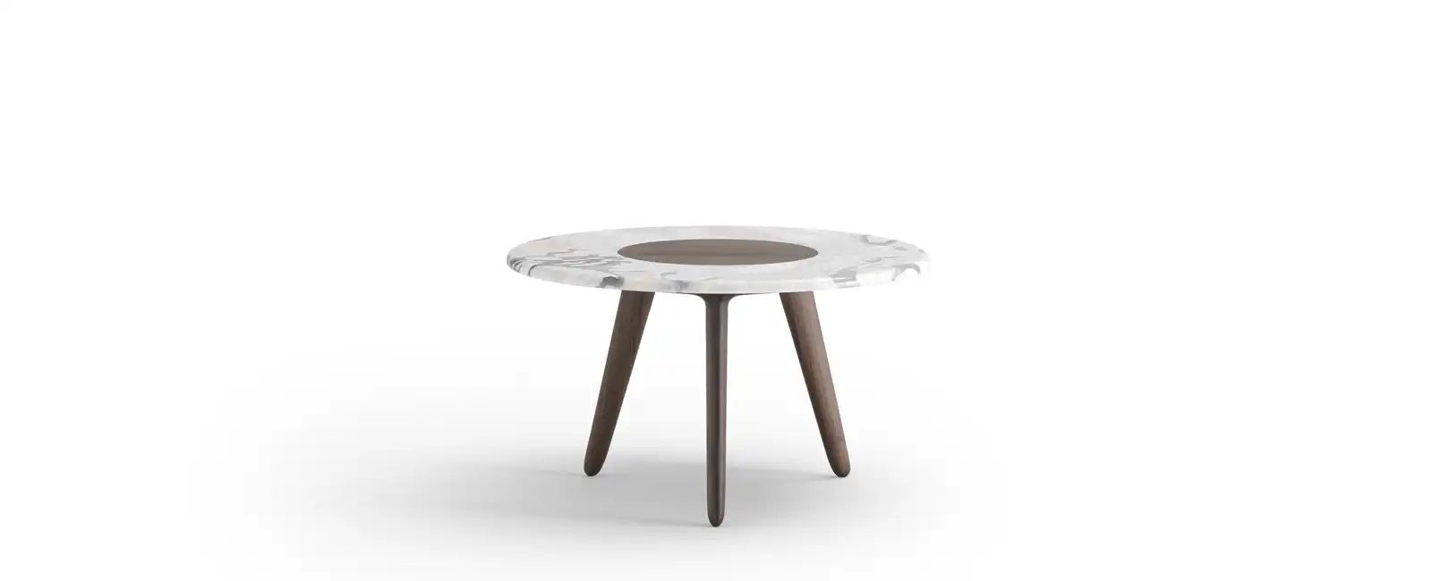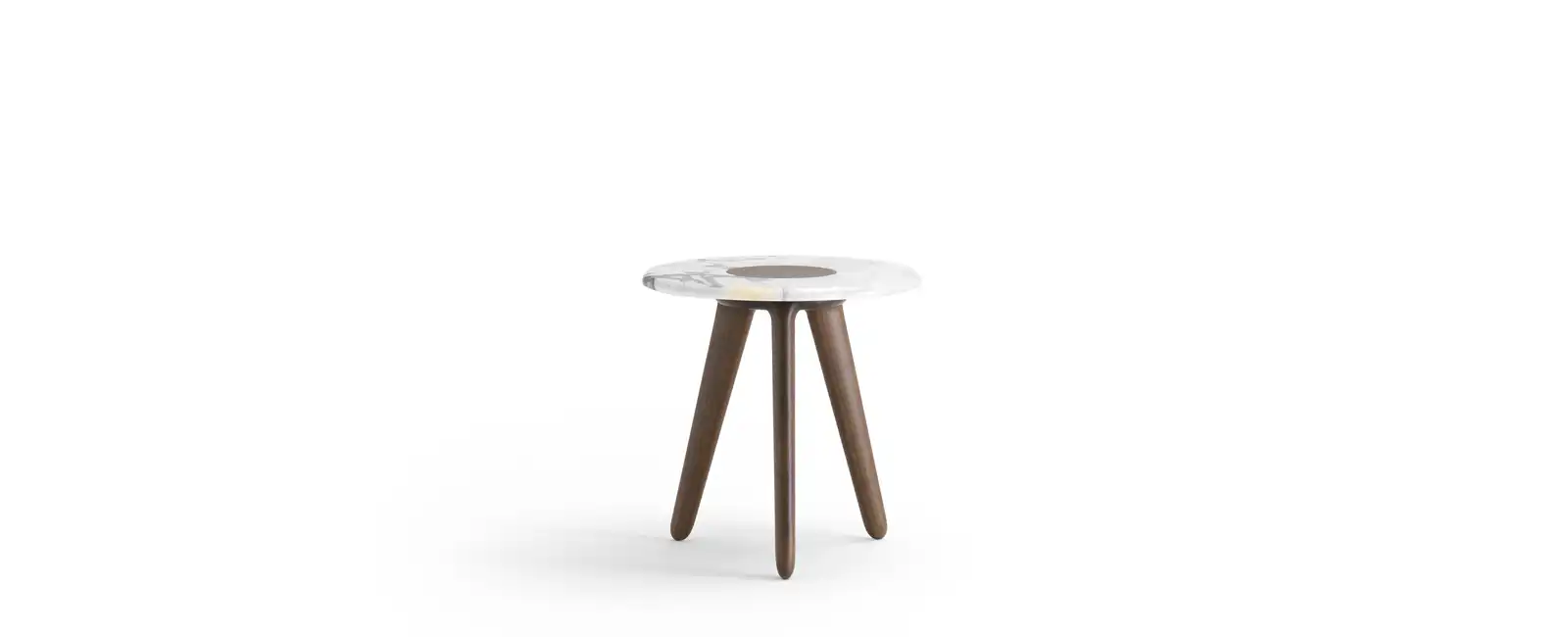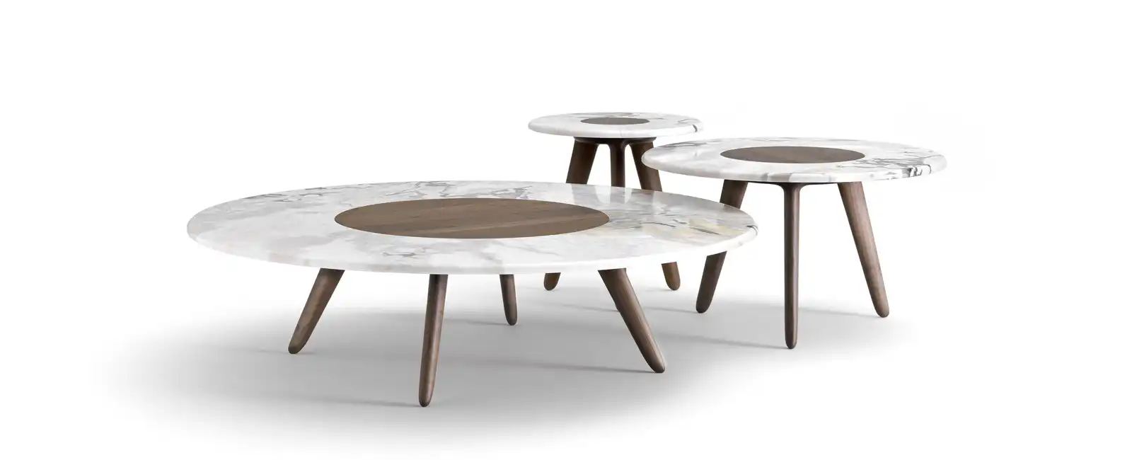 Tavolini con struttura in noce canaletto massello e prezioso piano marmo dover white.