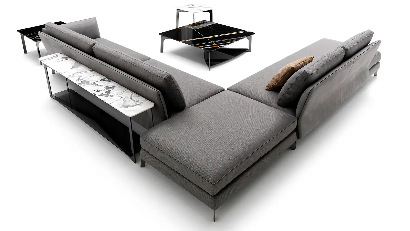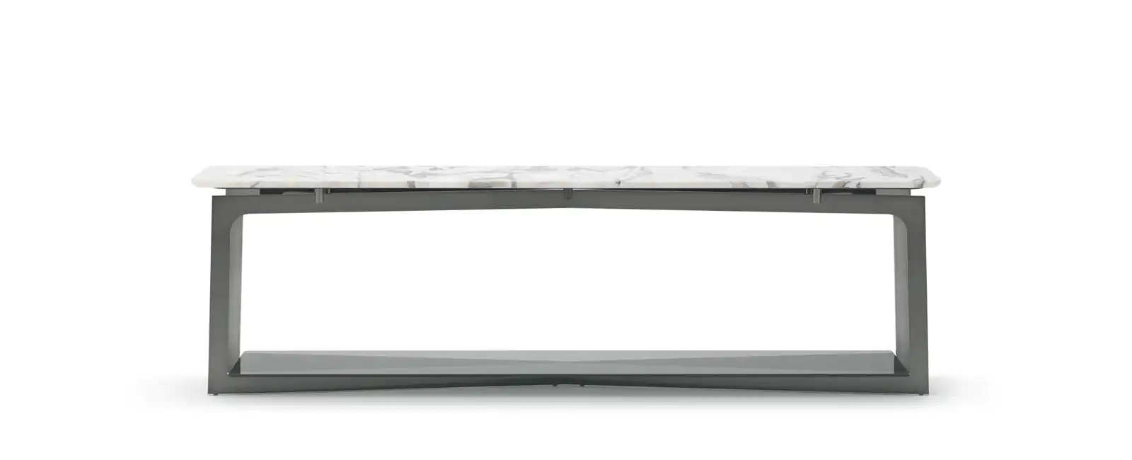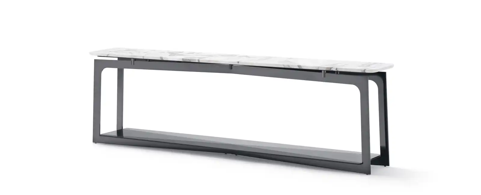 Consolle con struttura in elegante nichel nero lucido, con prezioso piano in marmo e pianetto in vetro fumè.