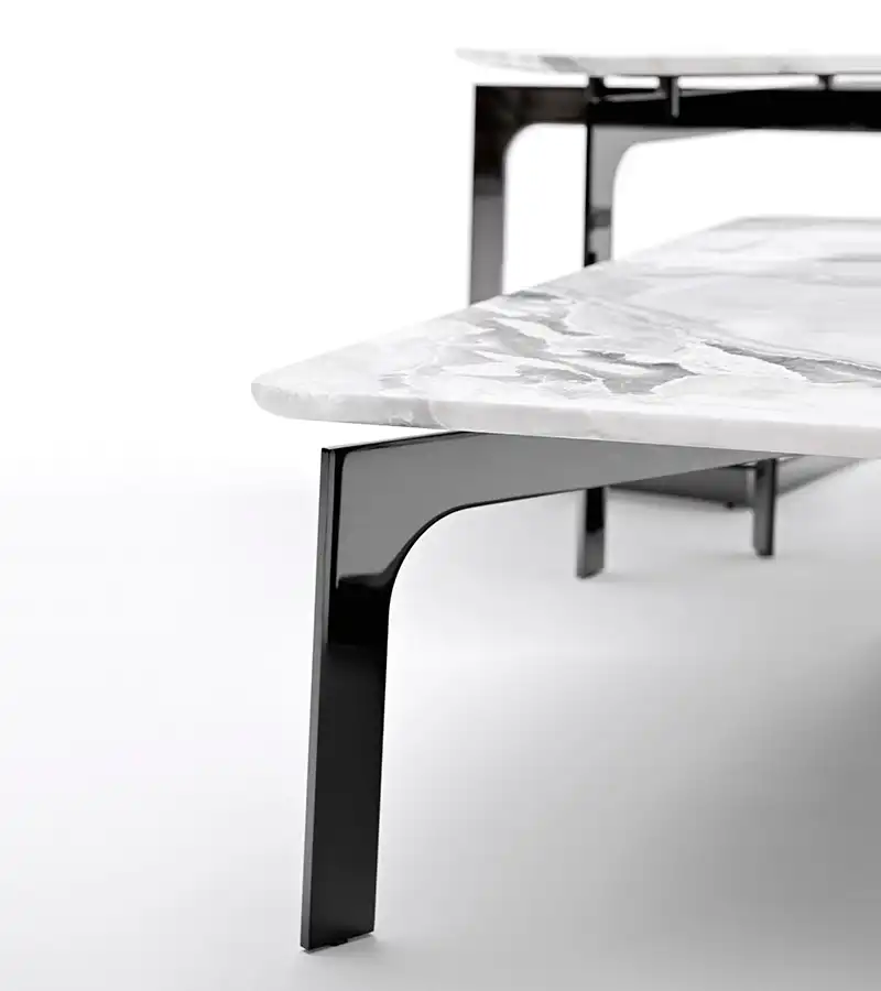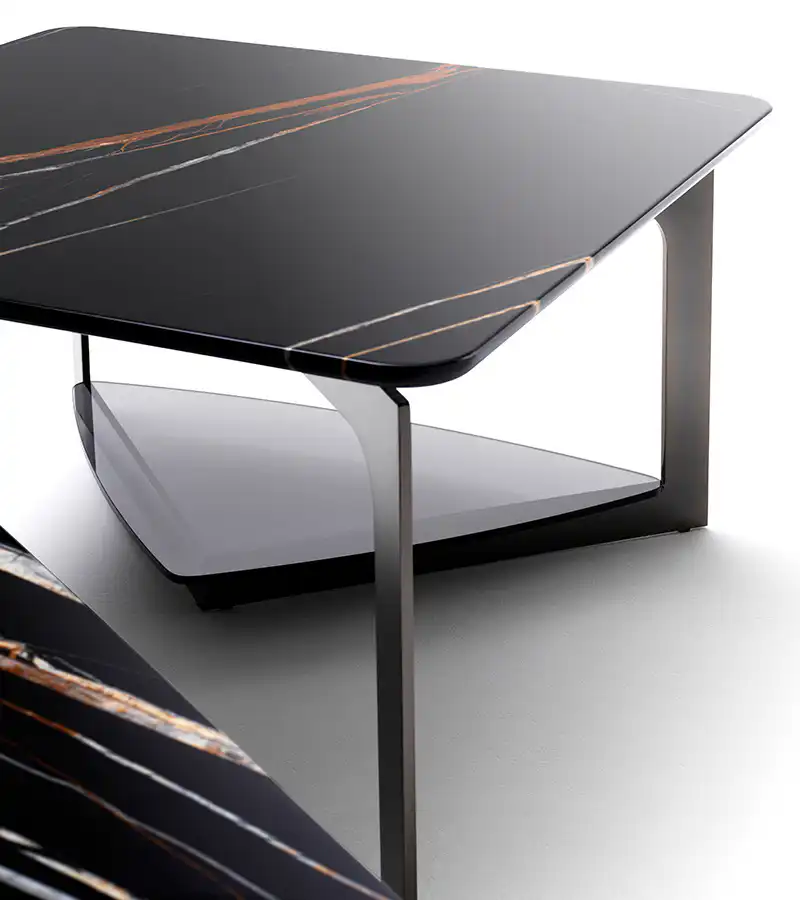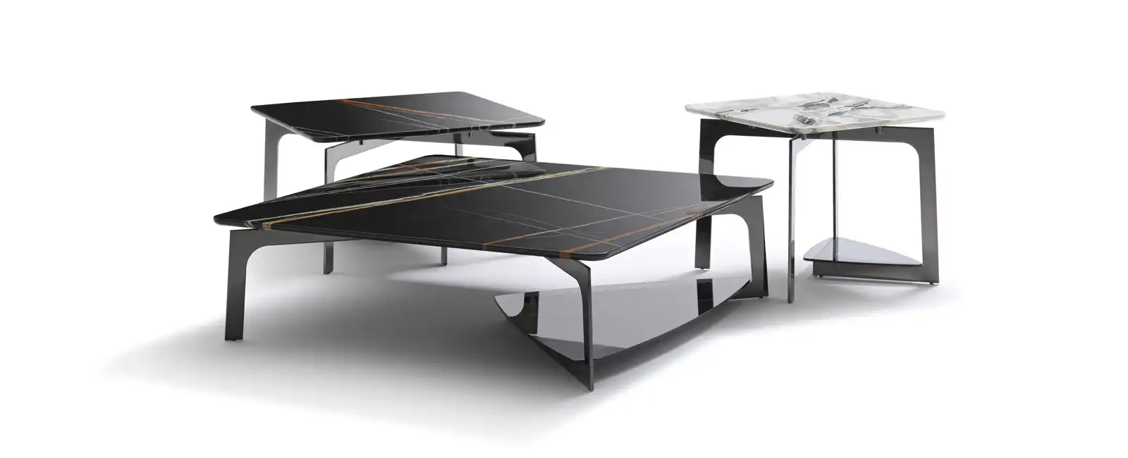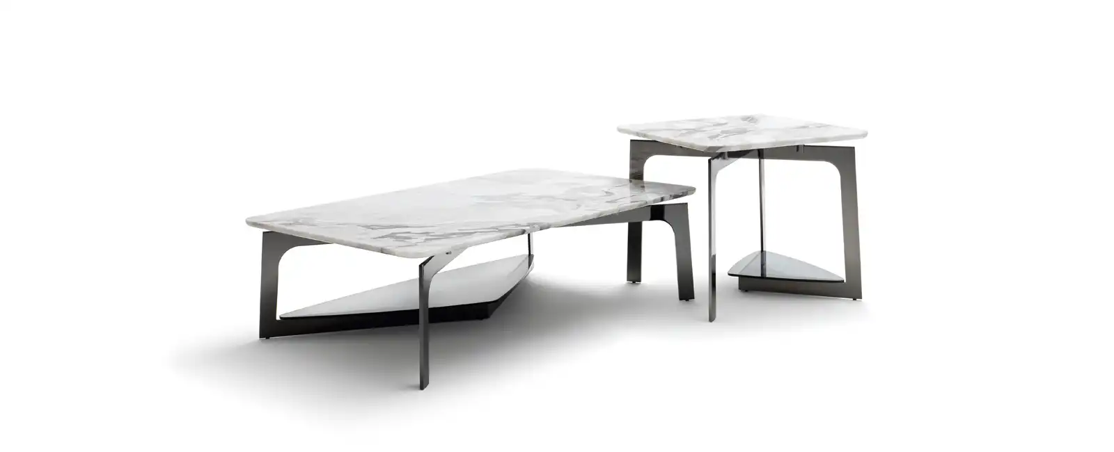 Tavolini con struttura in elegante nichel nero lucido, prezioso piano in marmo e pianetto in vetro fumè.