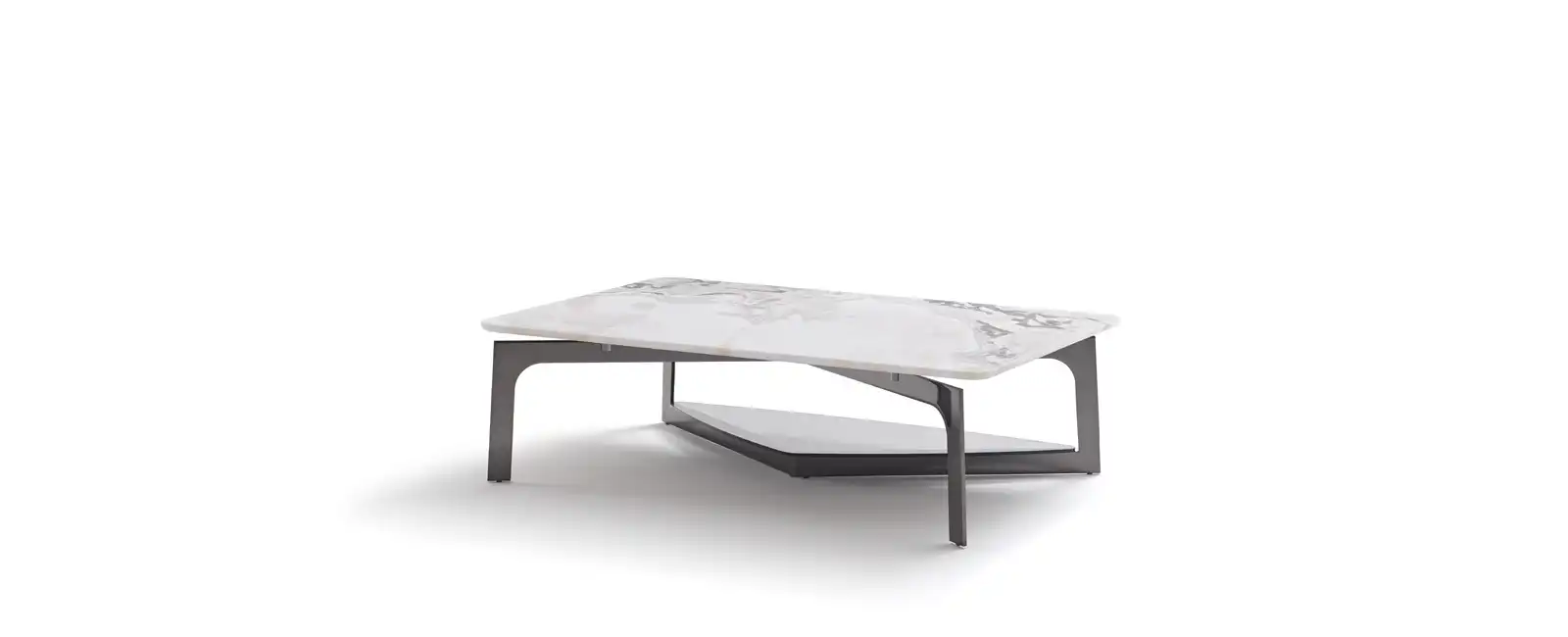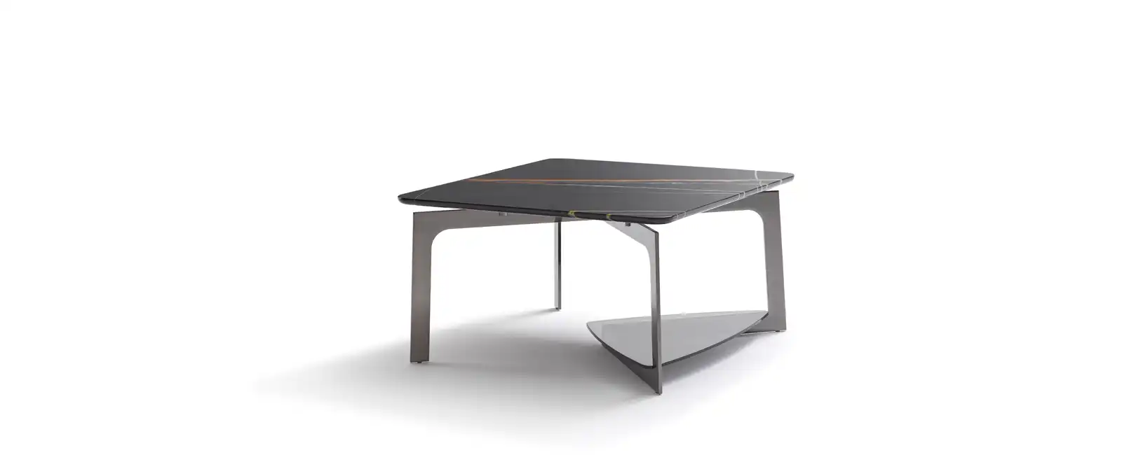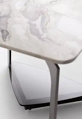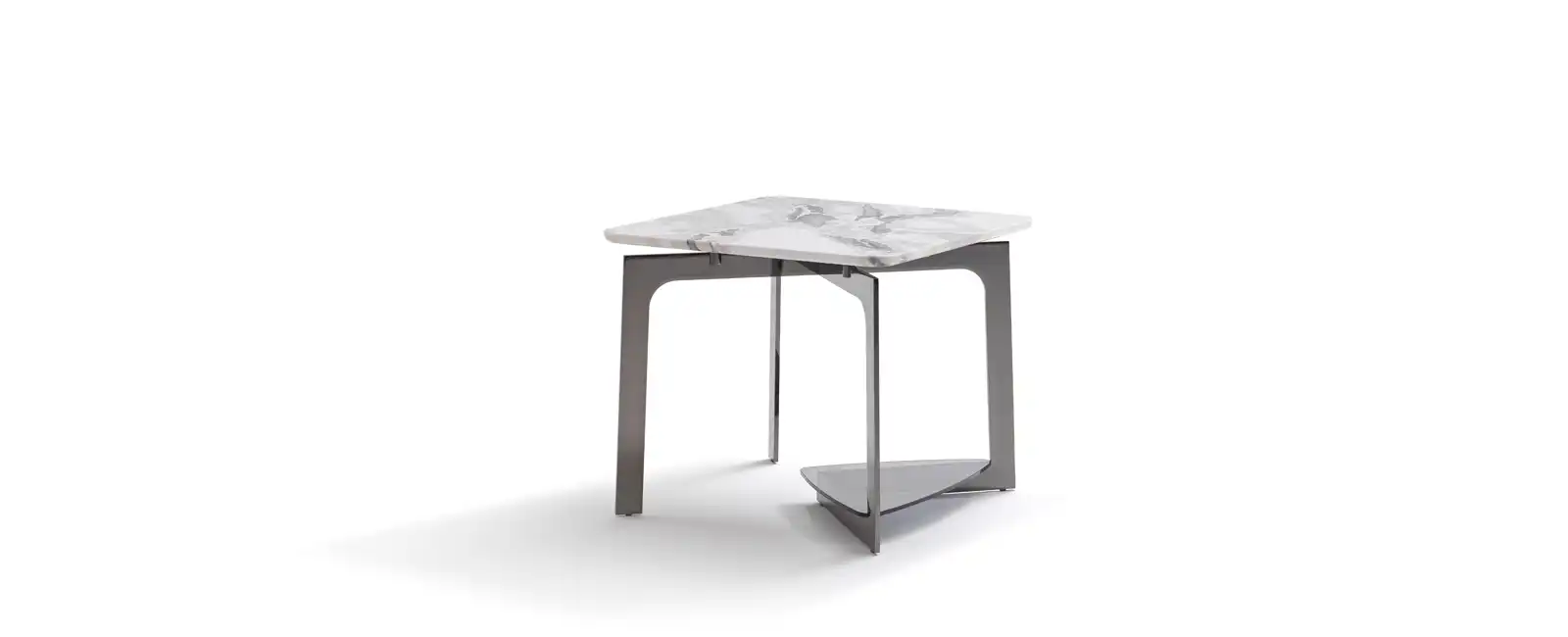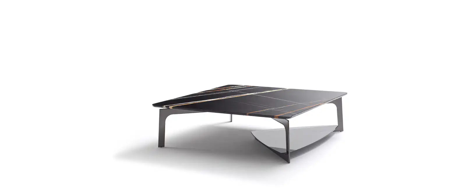 Tavolini con struttura in elegante nichel nero lucido, prezioso piano in marmo e pianetto in vetro fumè.
